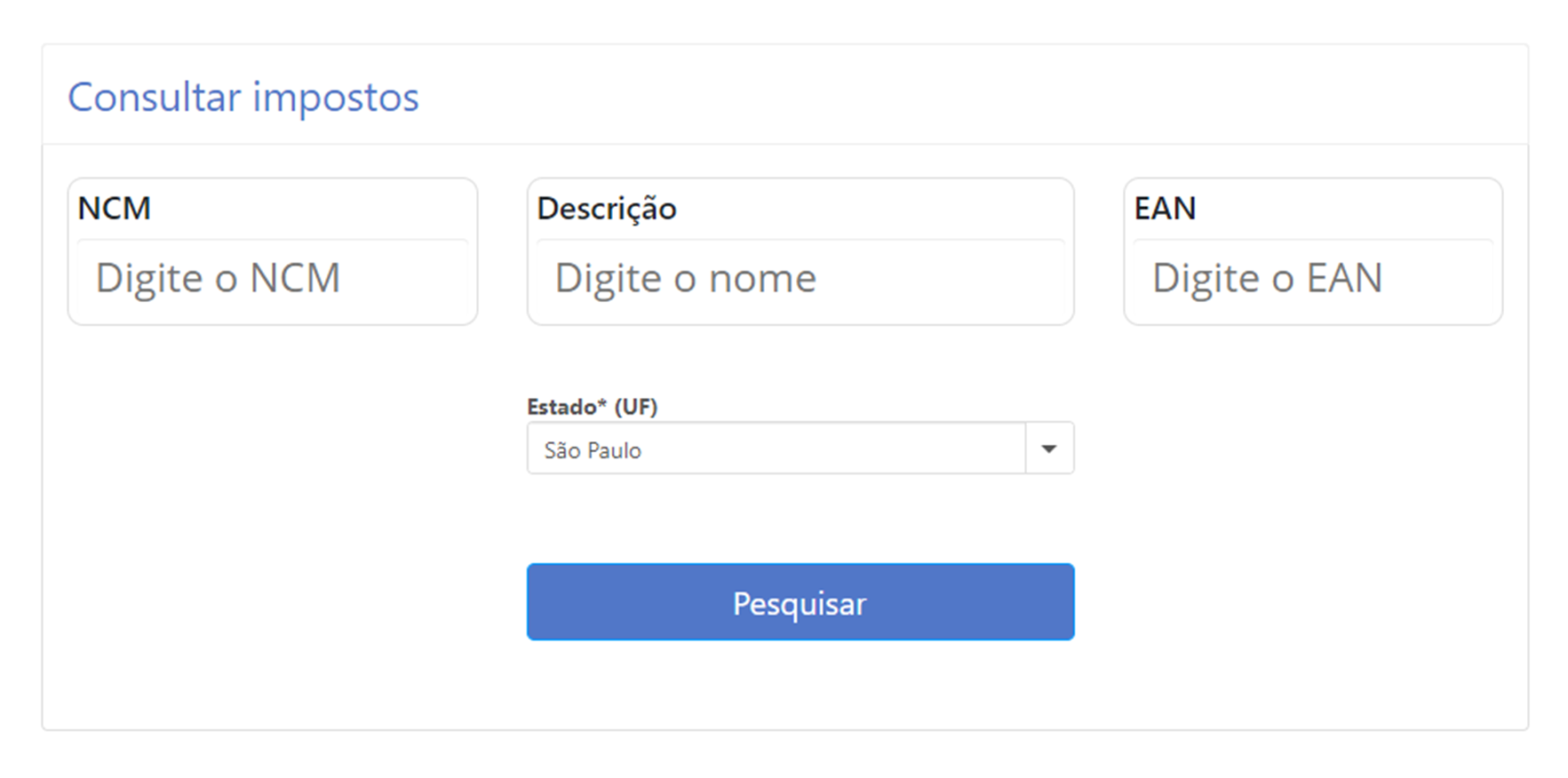 Você pode consultar os impostos e tributações por diversos meios. Seja NCM, descrição ou EAN (Código de Barras).